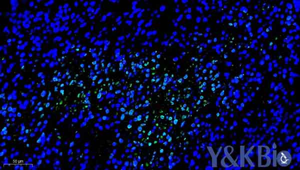 2.荧光tunel:DAPI染出来的细胞核在紫外的激发下为蓝色,阳性表达为绿色。